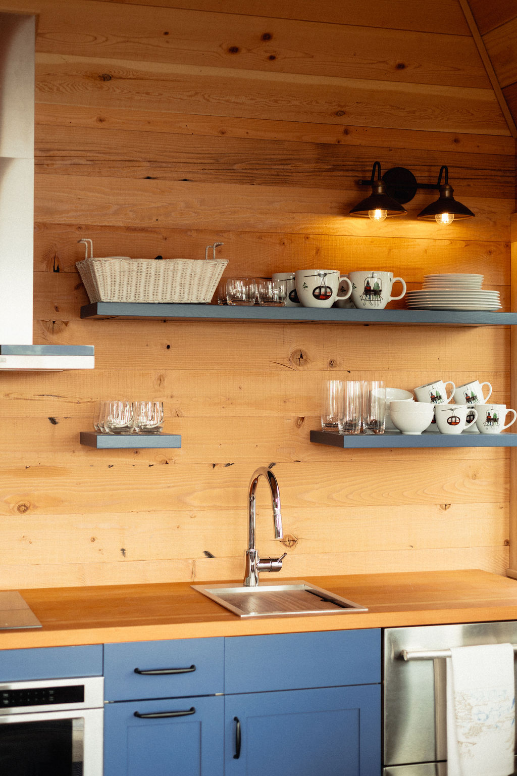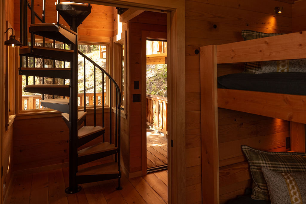 Inside the treehouse, natural materials bring warmth and texture to the space. The walls are finished in tongue-and-groove reclaimed Douglas fir with a resawn face, while the main floor features tongue-and-groove reclaimed fir flooring with a brushed finish. Hemlock interior trim highlights the craftsmanship throughout.