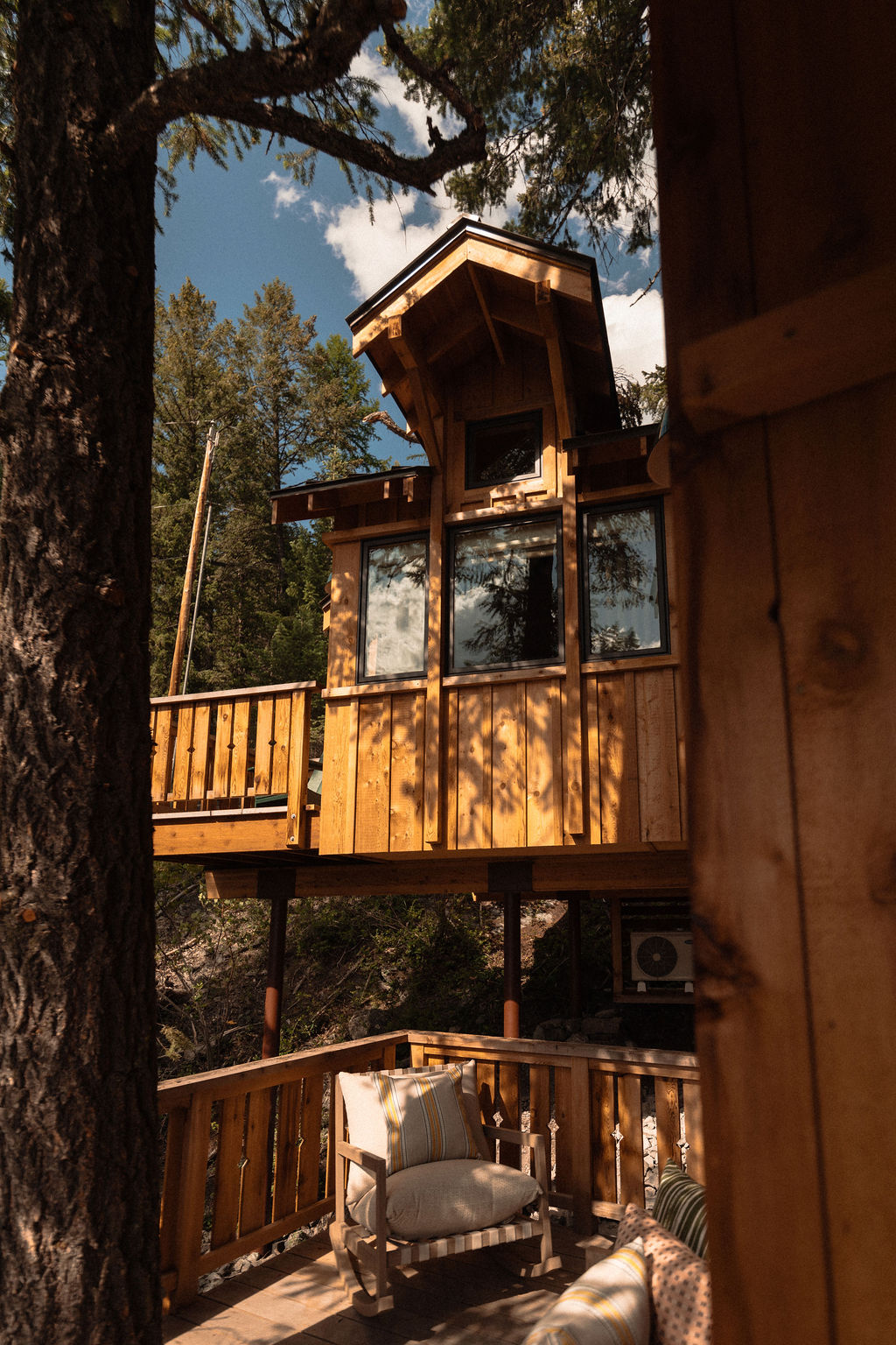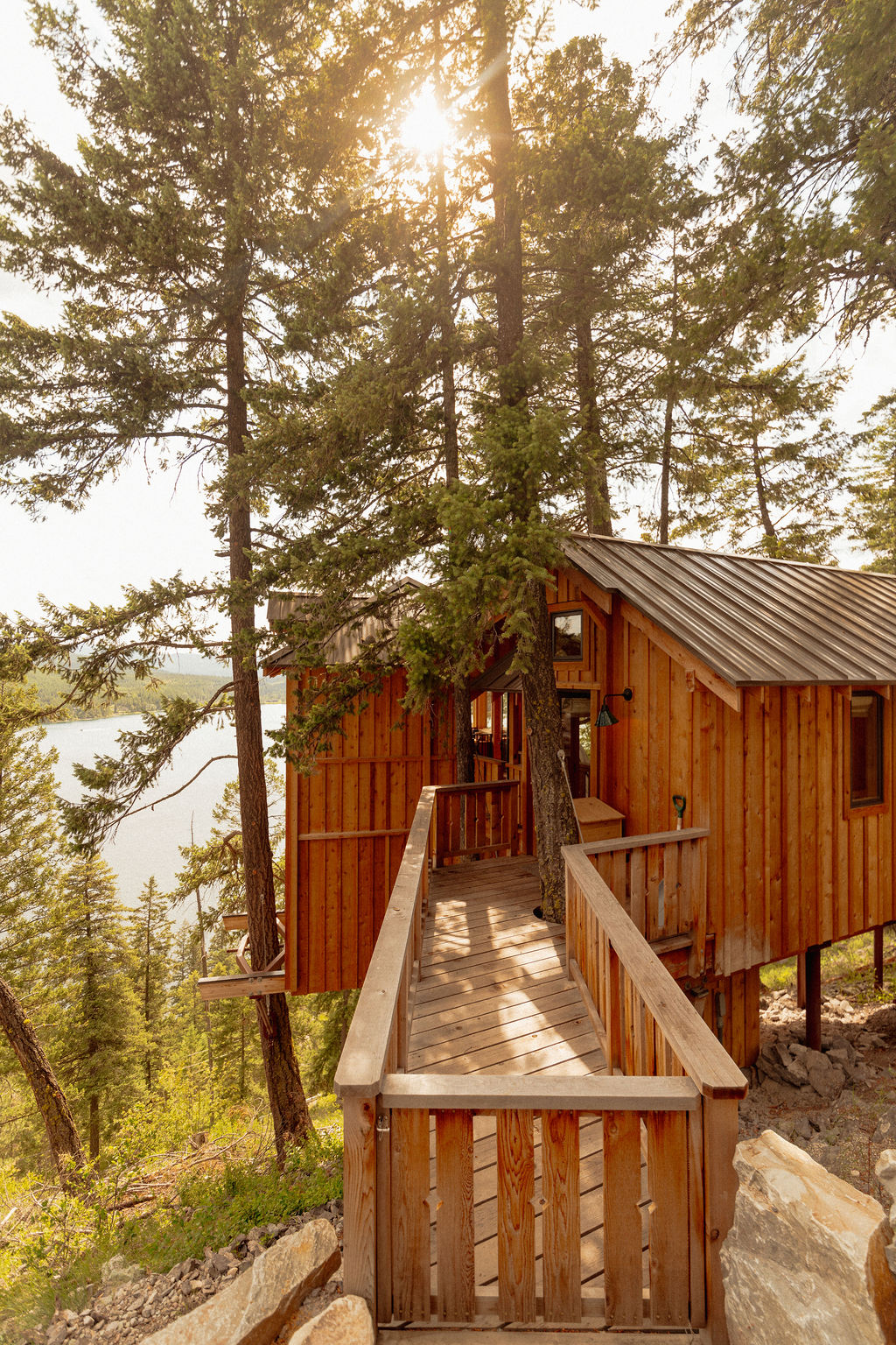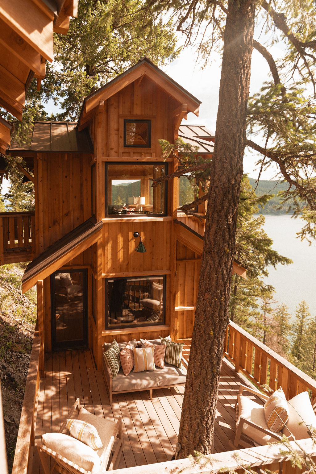 Perched on a steep hillside in Whitefish, Montana, this treehouse was built to create a place where friends, family, and grandkids could gather and soak in the view together. The Nelson Treehouse team designed and built the structure to nest naturally among the surrounding Douglas firs, while the warm and inviting interiors were thoughtfully designed by Hunter Interior Design.