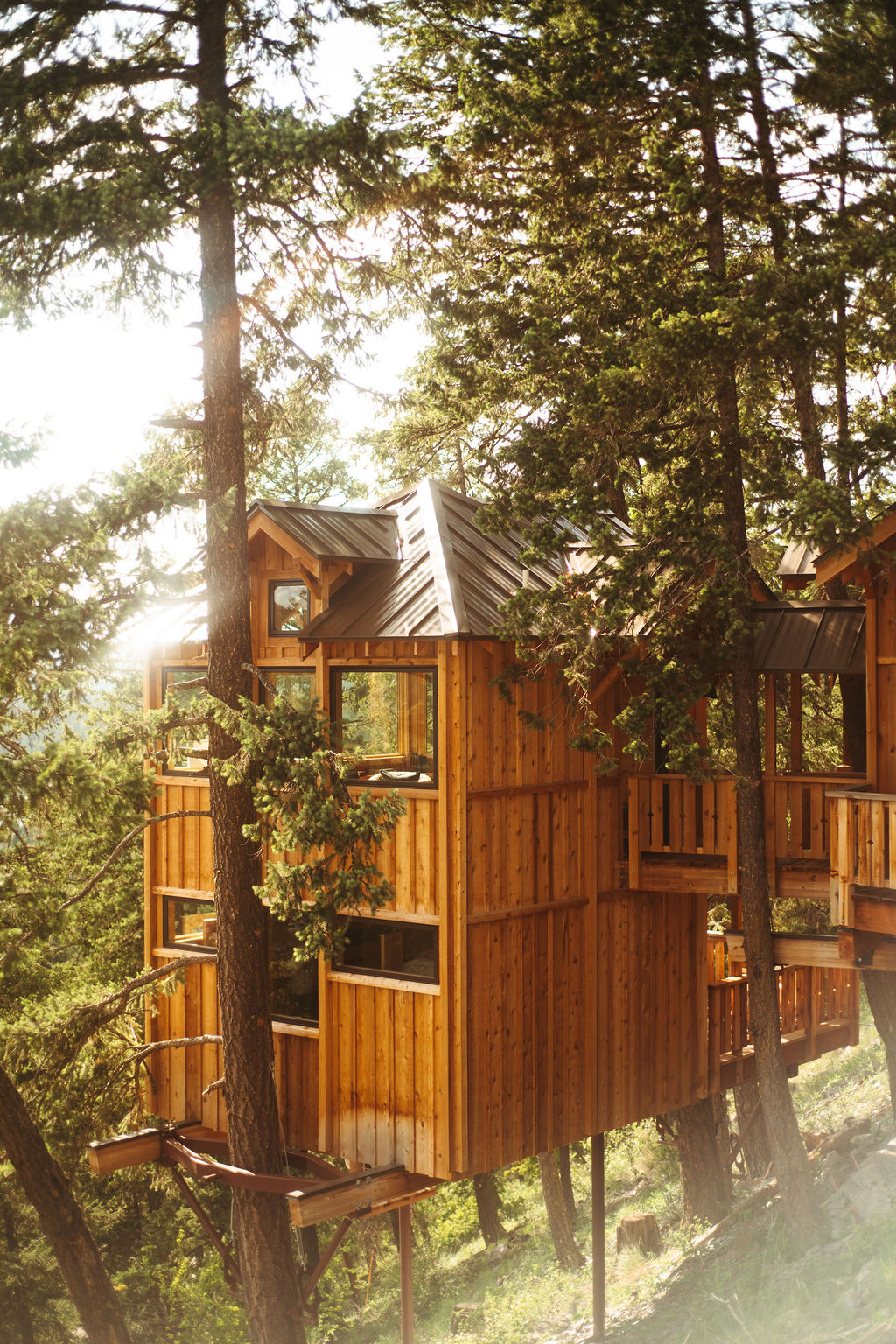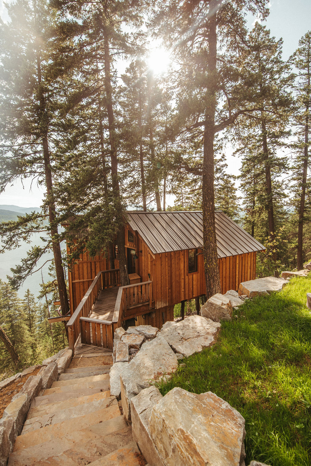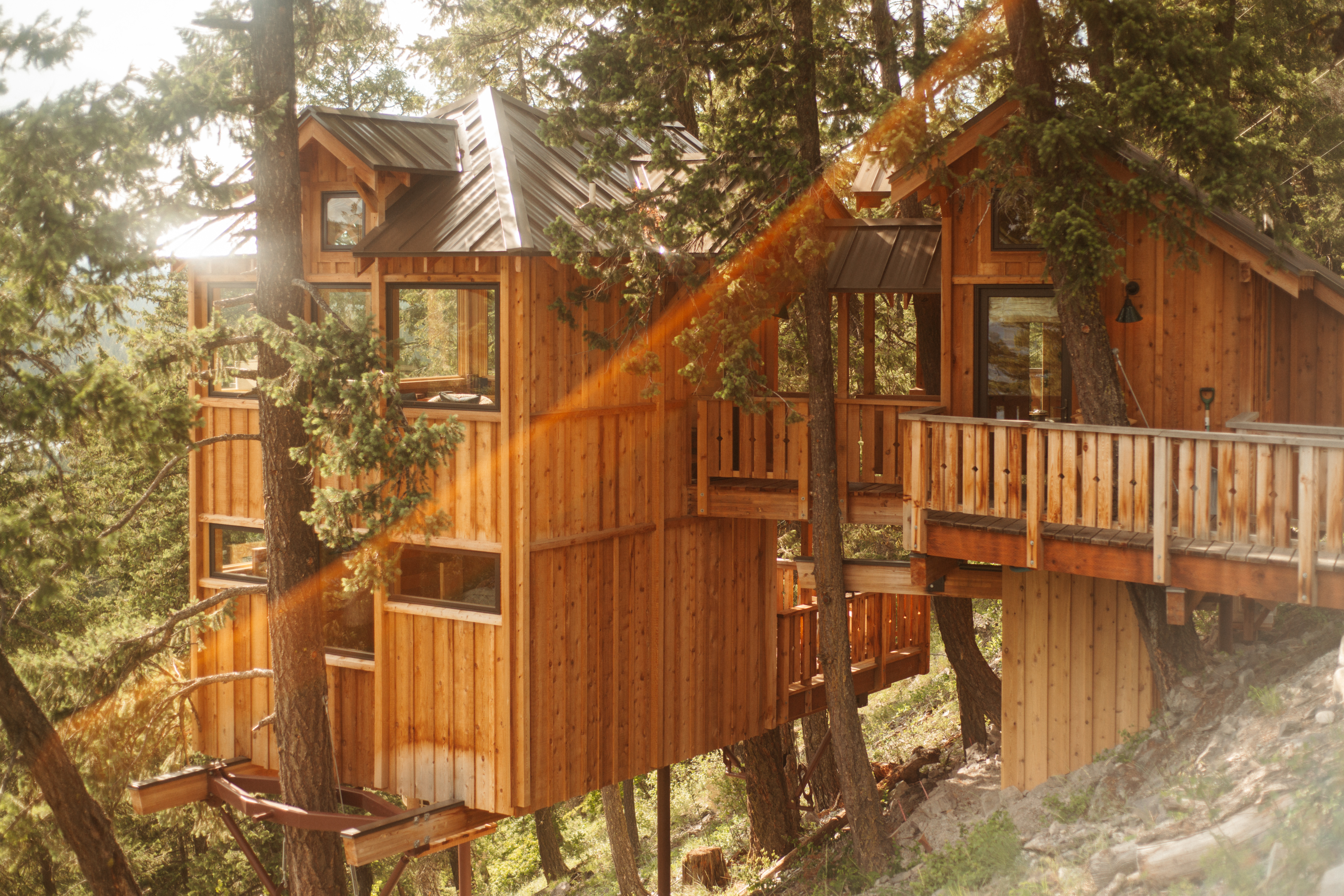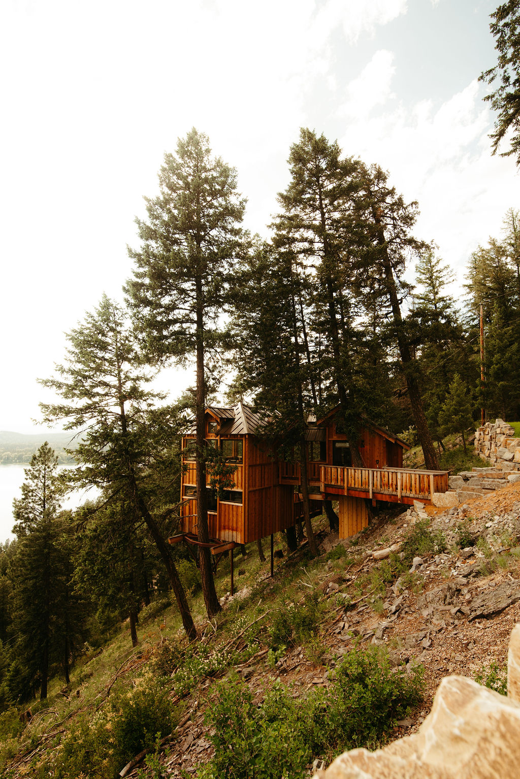 Perched on a steep hillside in Whitefish, Montana, this treehouse was built to create a place where friends, family, and grandkids could gather and soak in the view together. The Nelson Treehouse team designed and built the structure to nest naturally among the surrounding Douglas firs, while the warm and inviting interiors were thoughtfully designed by Hunter Interior Design.