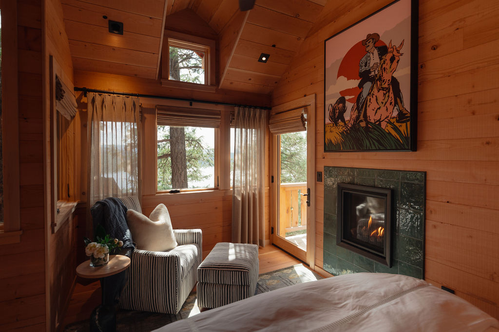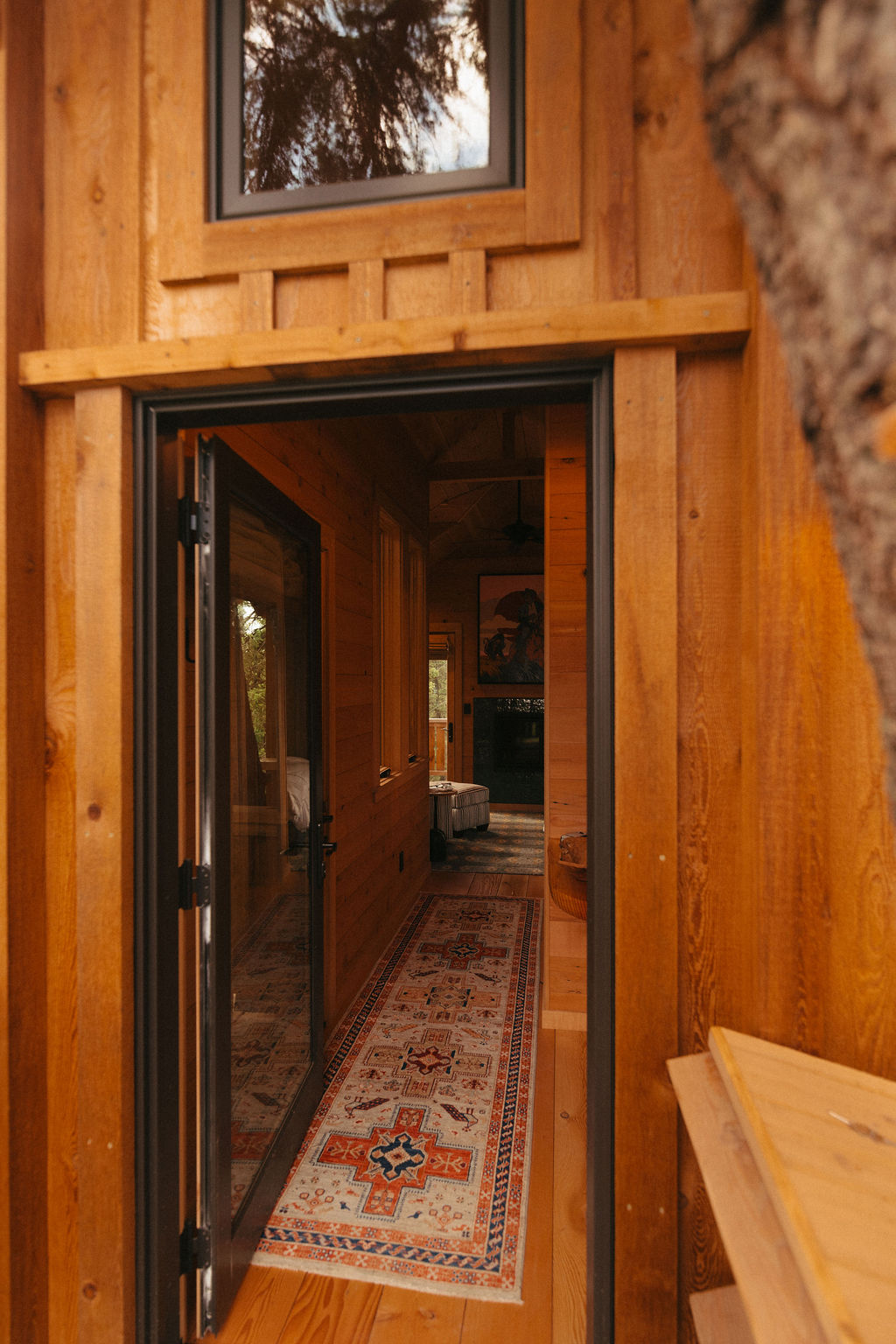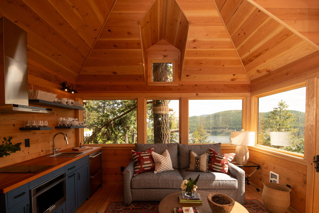 The interior design, thoughtfully created by the team at Hunter Interior Design, complements the natural materials of the treehouse while keeping the focus on the surrounding landscape. Warm textiles, layered textures, and comfortable furnishings bring softness and balance to the reclaimed wood interior.