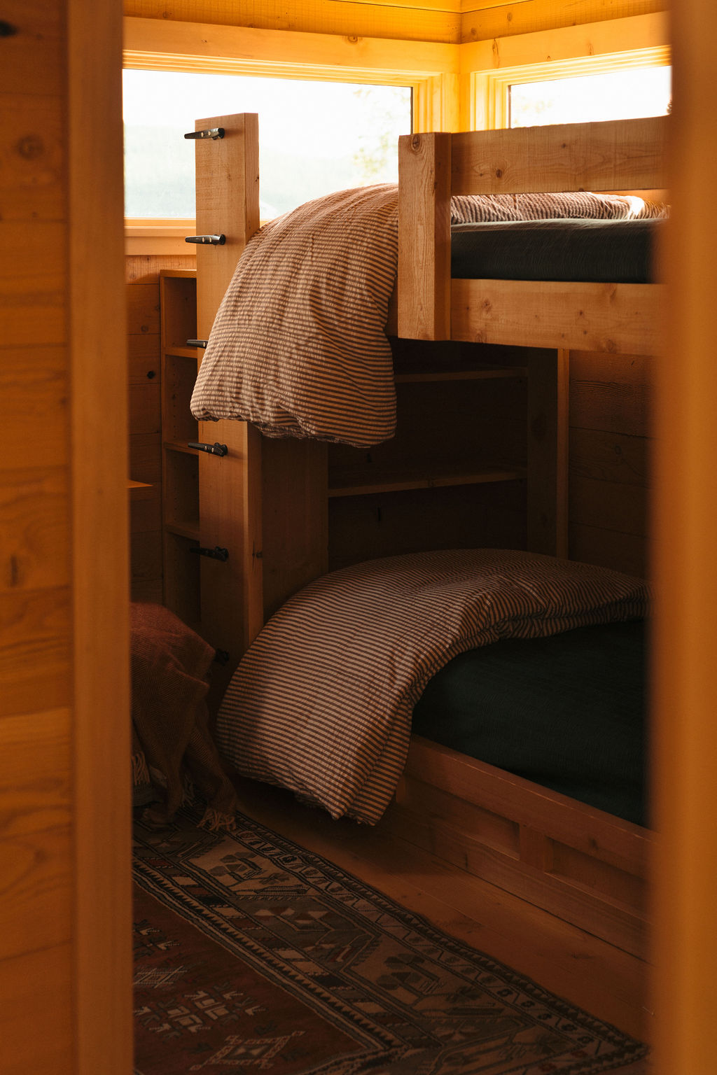 Custom built-in twin bunks create a cozy hideaway for kids and grandkids, with storage nearby for gear and overnight bags.