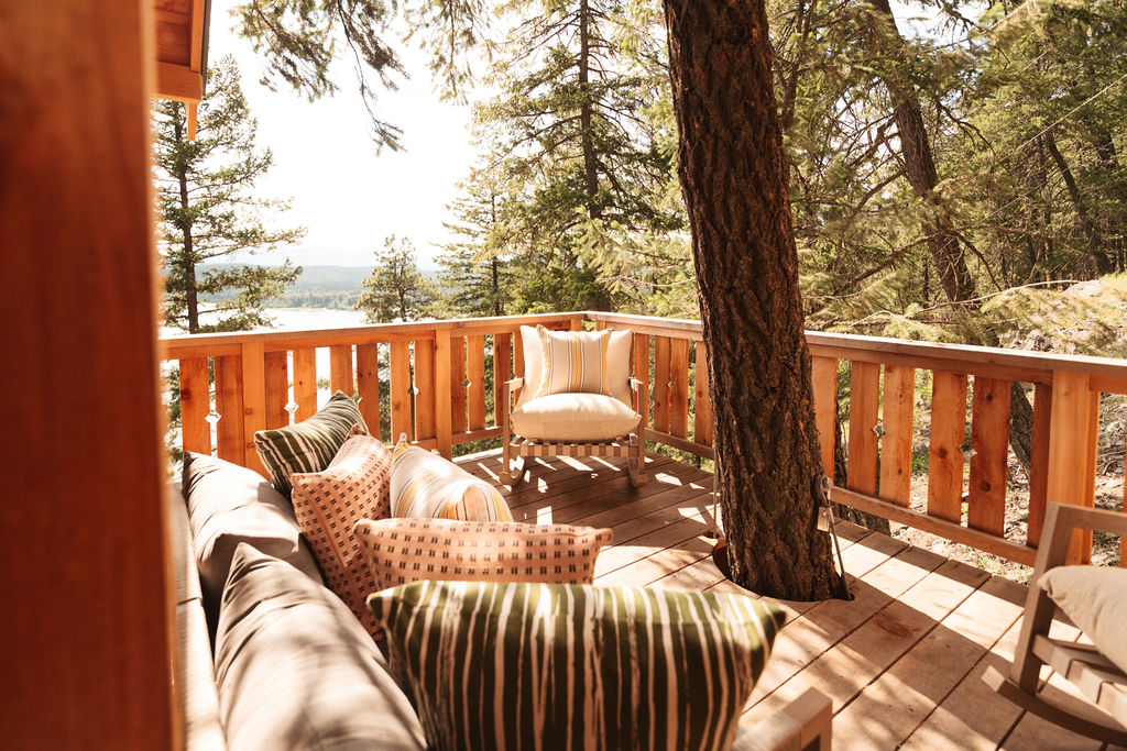 Just outside the bunkhouse, a deck extends out into the trees, offering one of the most unique perspectives of the entire build.