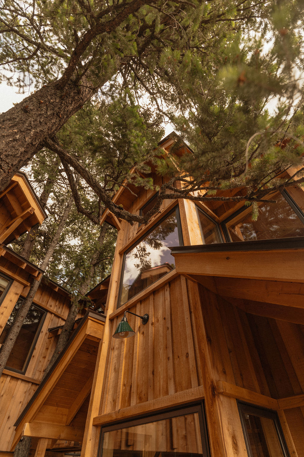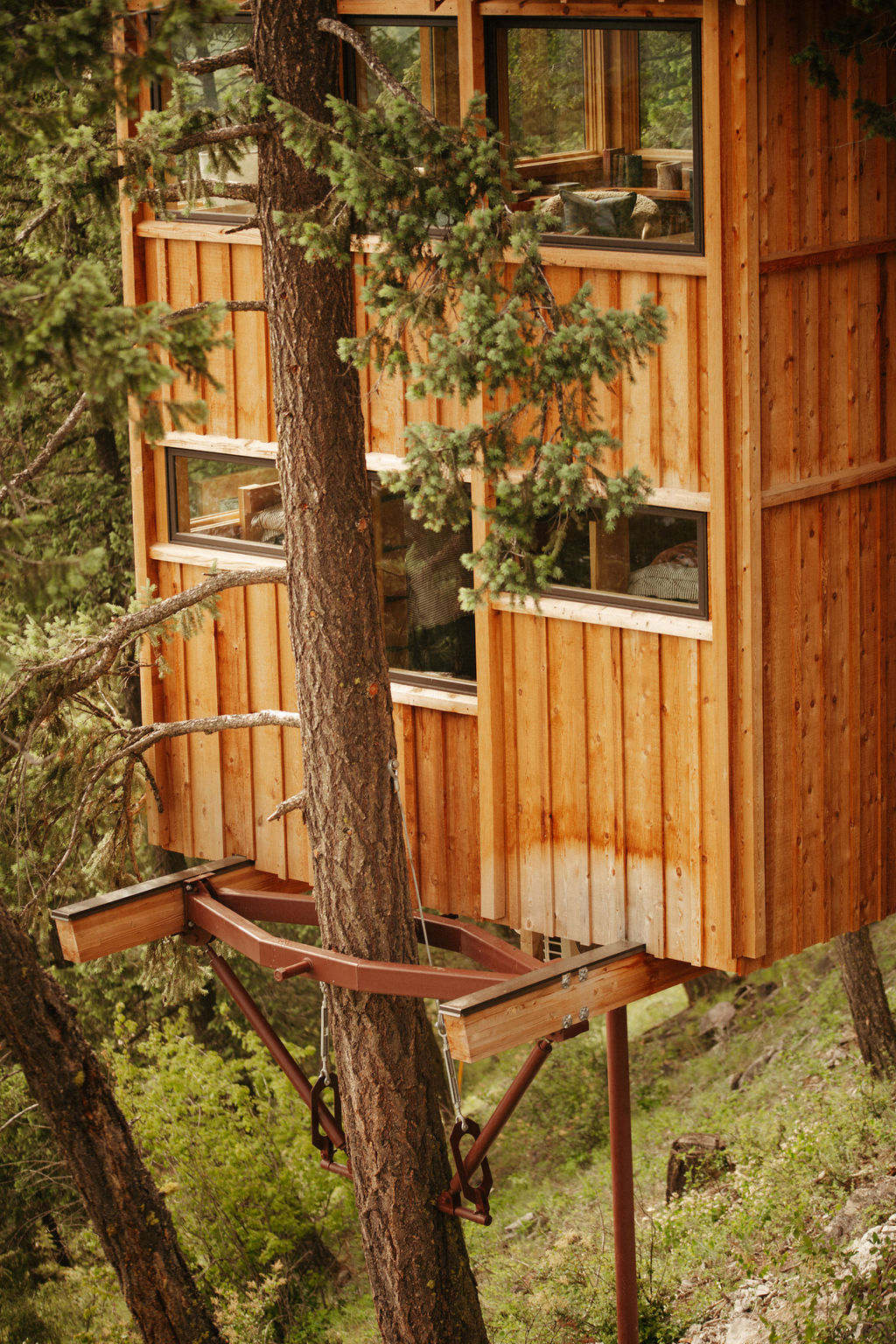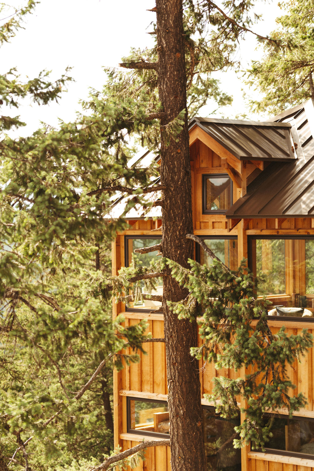 From the outside, the treehouse feels right at home in the Montana landscape. Board and batten Western Red Cedar siding, cedar decking, and alpine-style guardrails give it the look of a cozy mountain ski lodge.