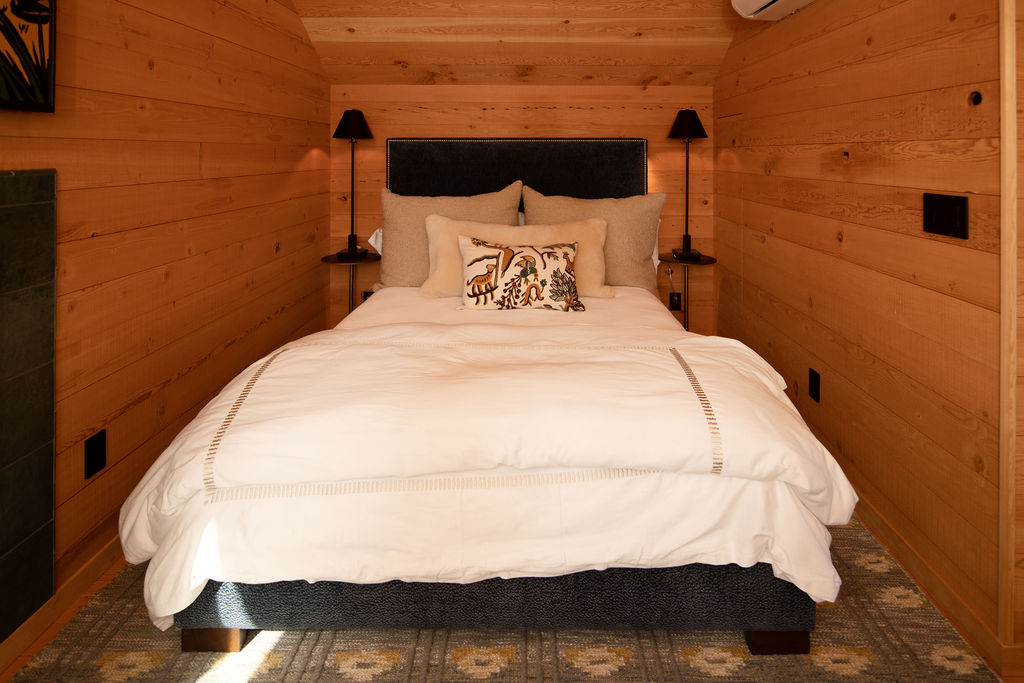 The bedroom feels quiet and tucked into the trees, with a queen bed positioned to take in the lake views.