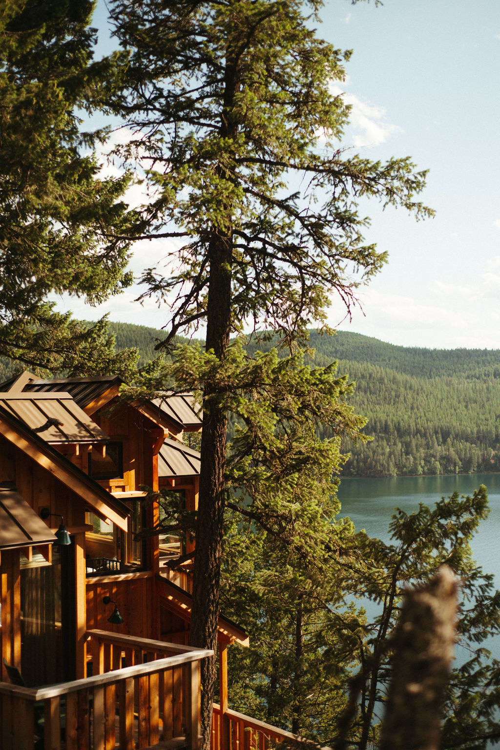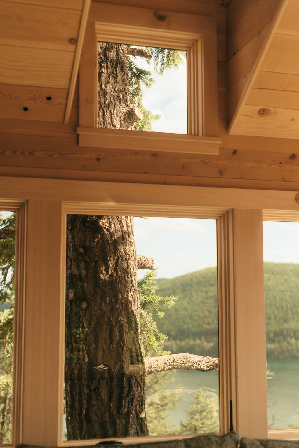 A Douglas fir rises right up through the center of the deck. From here, the lake opens up below with incredible views, while the first pod towers just off to the side giving you a new appreciation for the scale and structure of the build.